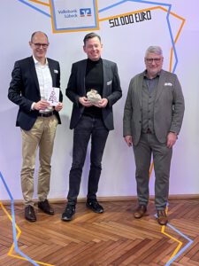 Die symbolische Übergabe der Spende erfolgte im Rahmen einer Feierstunde im Lübecker HanseLab durch die beiden Vorstände der Volksbank Lübeck, Bernhard Rogge und Christian Mehrens.